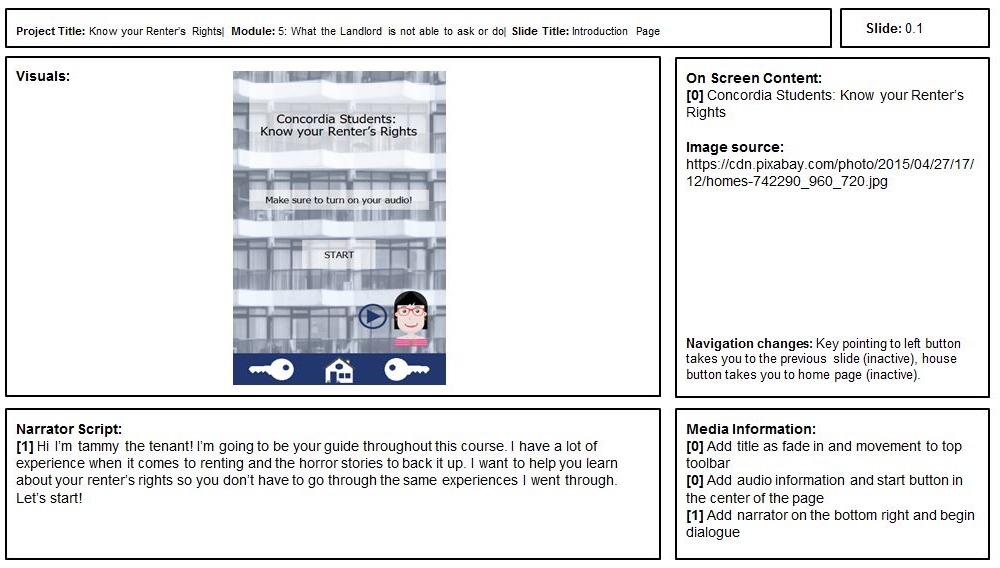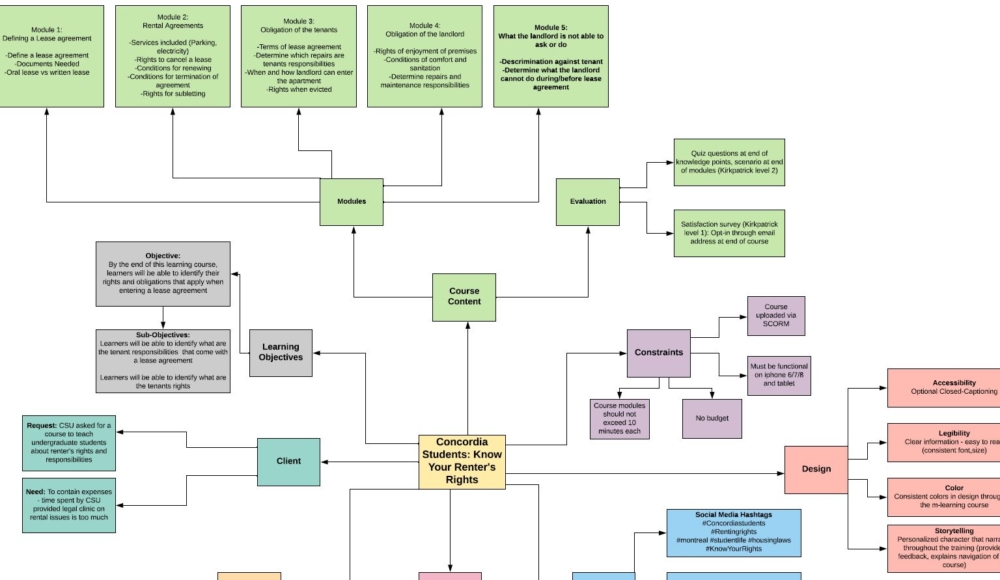 Our premise was that we were contracted by the Concordia Students Union (CSU) to create an m-learning course for use with iPhone 6/7/8. This was because there have been a number of undergraduate students who have rented for the first time and have had considerable issues, with a number of students turning up to the CSU Legal Information Clinic each week. The majority of the problems addressed at the legal clinic were a result of being uneducated about the laws regarding renting in Quebec. In order to reduce the amount of time spent on these issues, this course would be offered by the CSU for free to all undergraduate students.